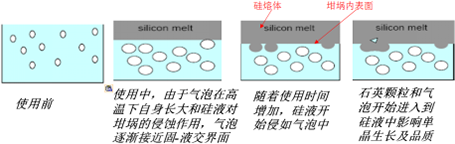 石英坩堝的內(nèi)表面氣泡含量坩堝最內(nèi)表層是指透明層中最靠近內(nèi)表面1-2mm的部分。圖中表明了在使用過程中,坩堝對硅液起作用的機(jī)理--由于與硅液接觸的內(nèi)表面不斷向硅液中熔... -